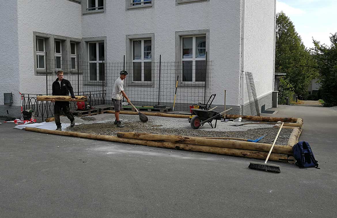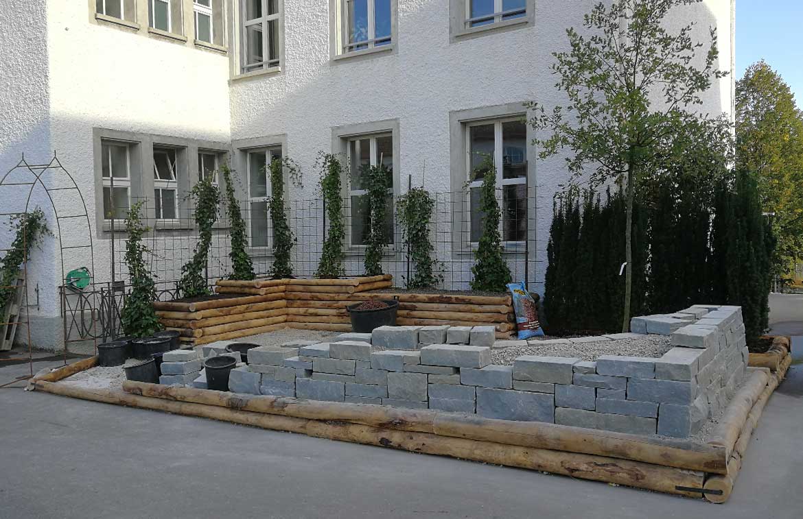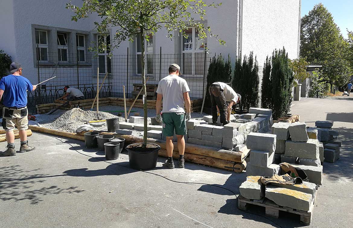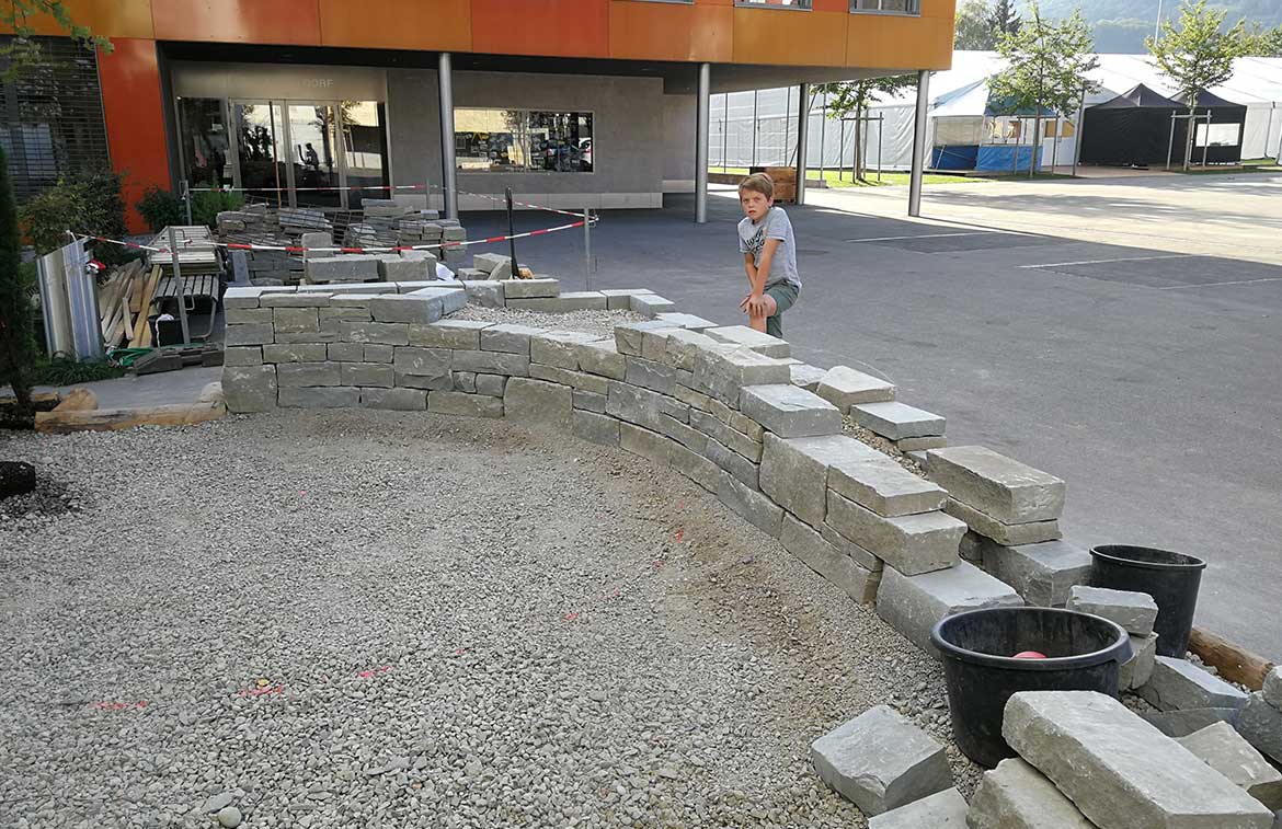 Die Kinder konnten unter Anleitung unserer Lernenden selber Steine bearbeiten und die angefangene Mauer erweitern - ein grosser Spass!