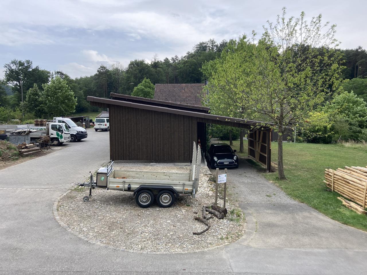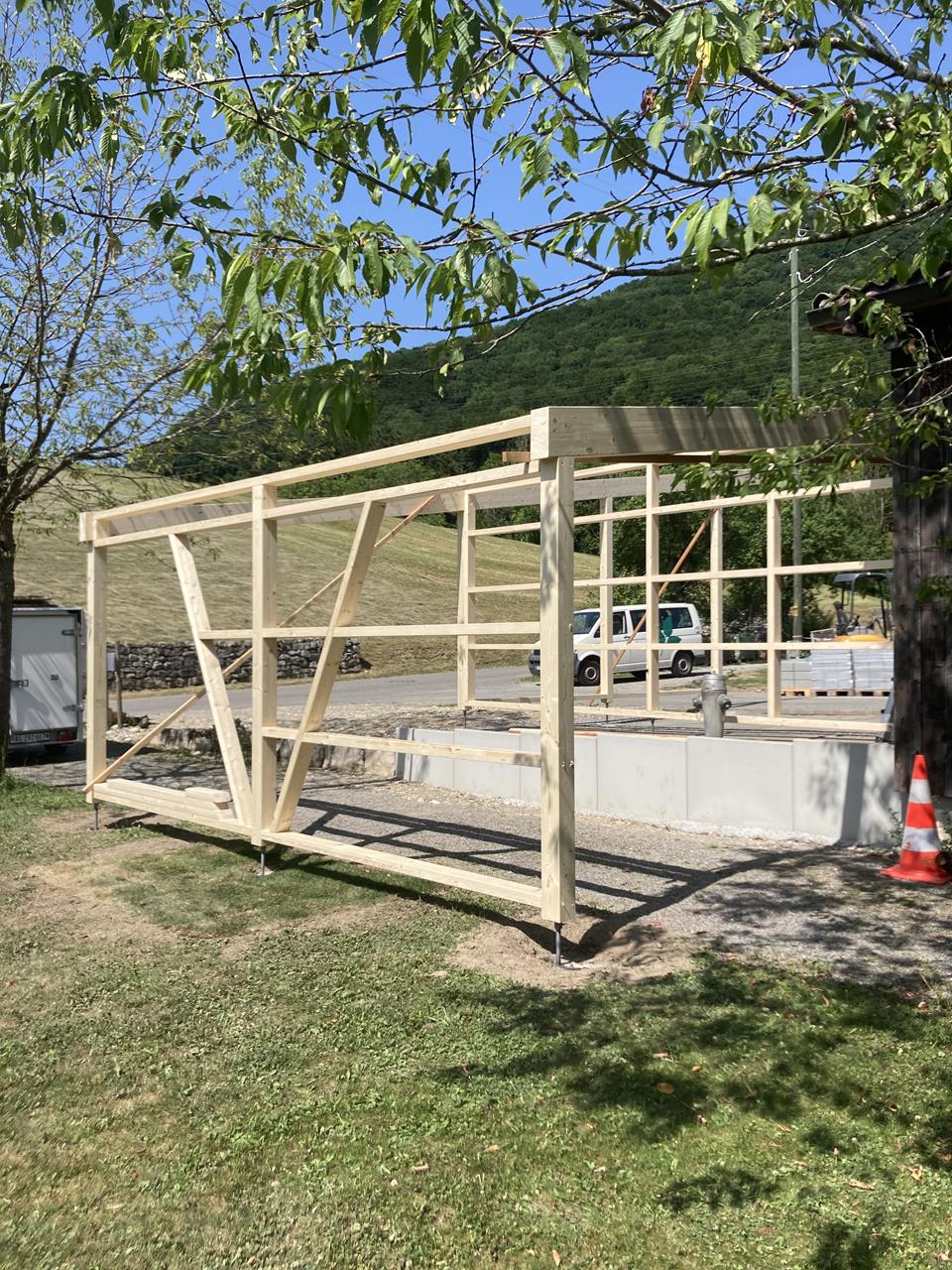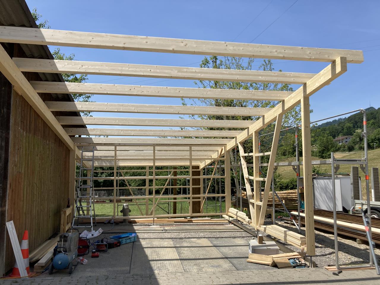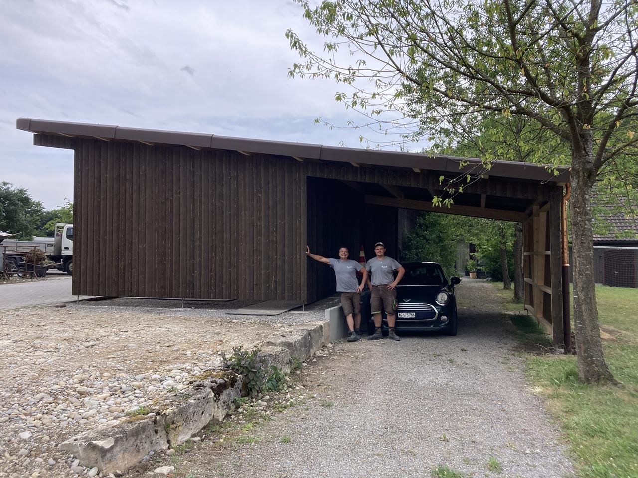 Unser Sohn Florian hat die Pläne gezeichnet und das Baugesuch vorbereitet. Nach längerem Hin und Her lag endlich die Baubewilligung vor und der Holzbauer konnte im Juni loslegen. Innert kürzester Zeit wurde unser Projekt realisiert. Das Berner-Team freut sich über den Unterstand für unsern Betrieb - und Sara ist glücklich über ihren gedeckten Parkplatz für ihr Fahzeug!