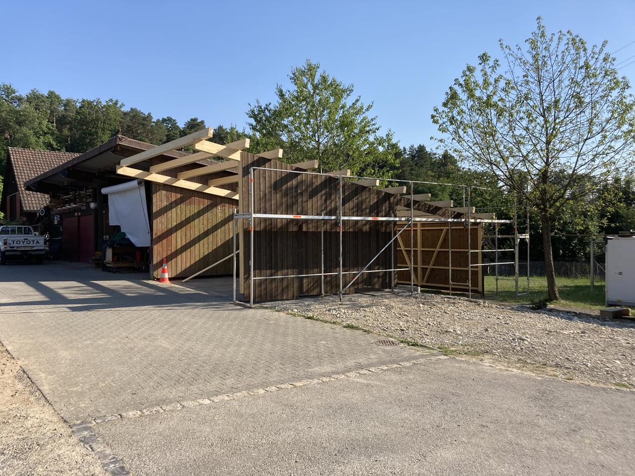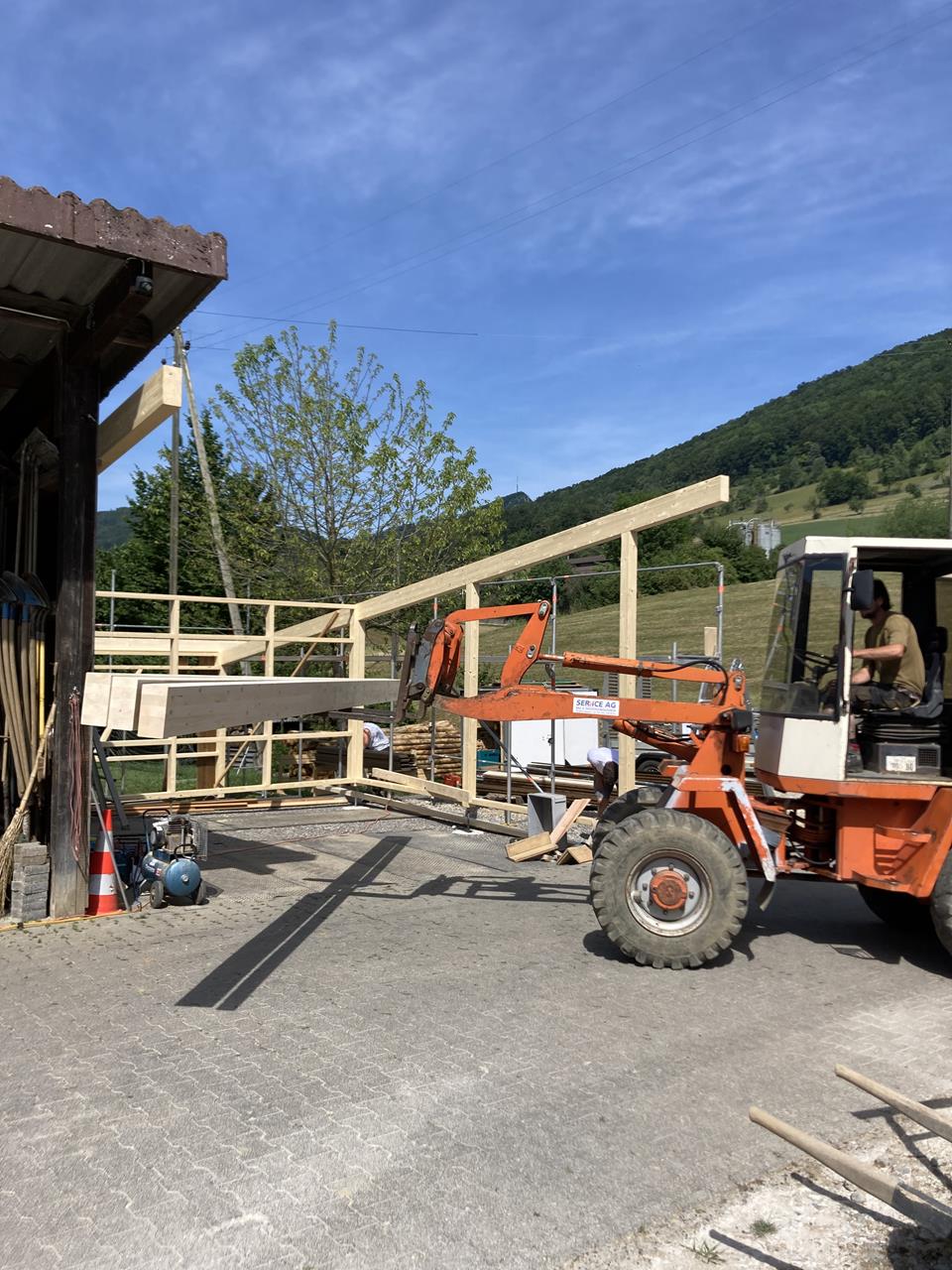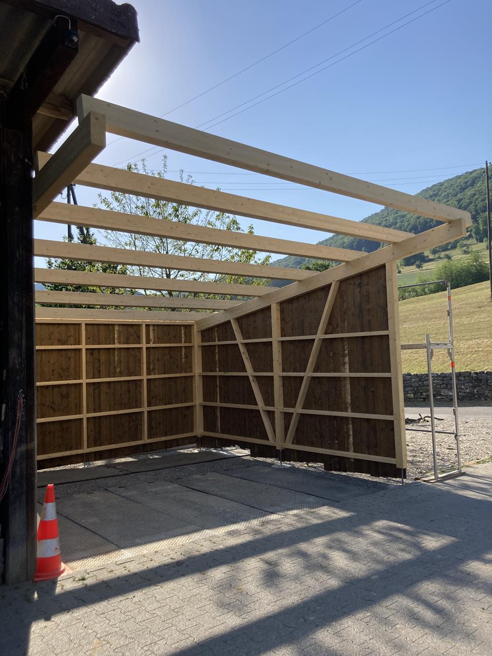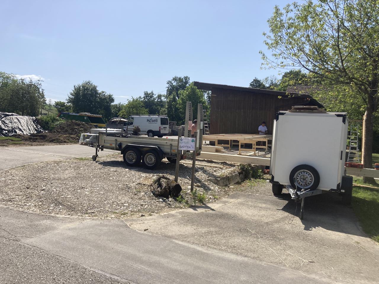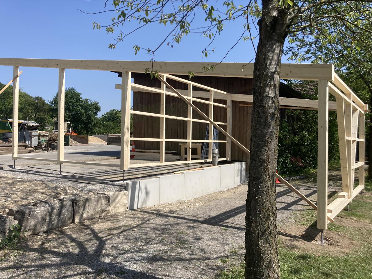 Unser Sohn Florian hat die Pläne gezeichnet und das Baugesuch vorbereitet. Nach längerem Hin und Her lag endlich die Baubewilligung vor und der Holzbauer konnte im Juni loslegen. Innert kürzester Zeit wurde unser Projekt realisiert. Das Berner-Team freut sich über den Unterstand für unsern Betrieb - und Sara ist glücklich über ihren gedeckten Parkplatz für ihr Fahzeug!