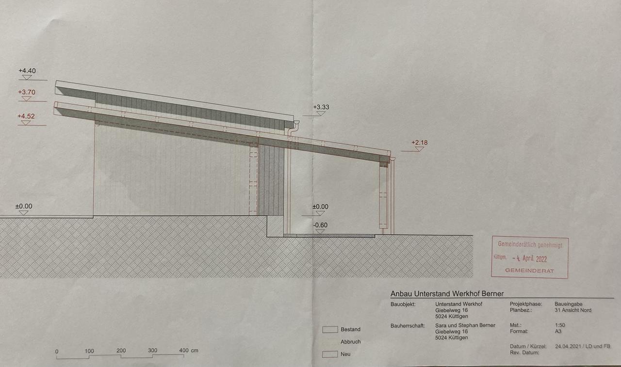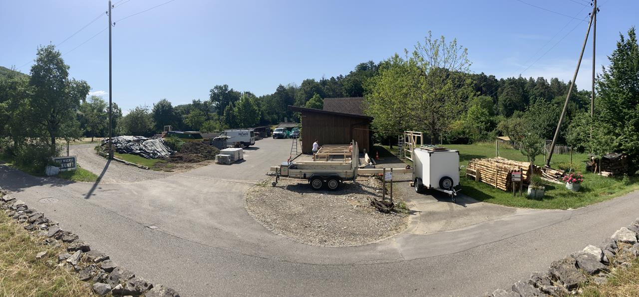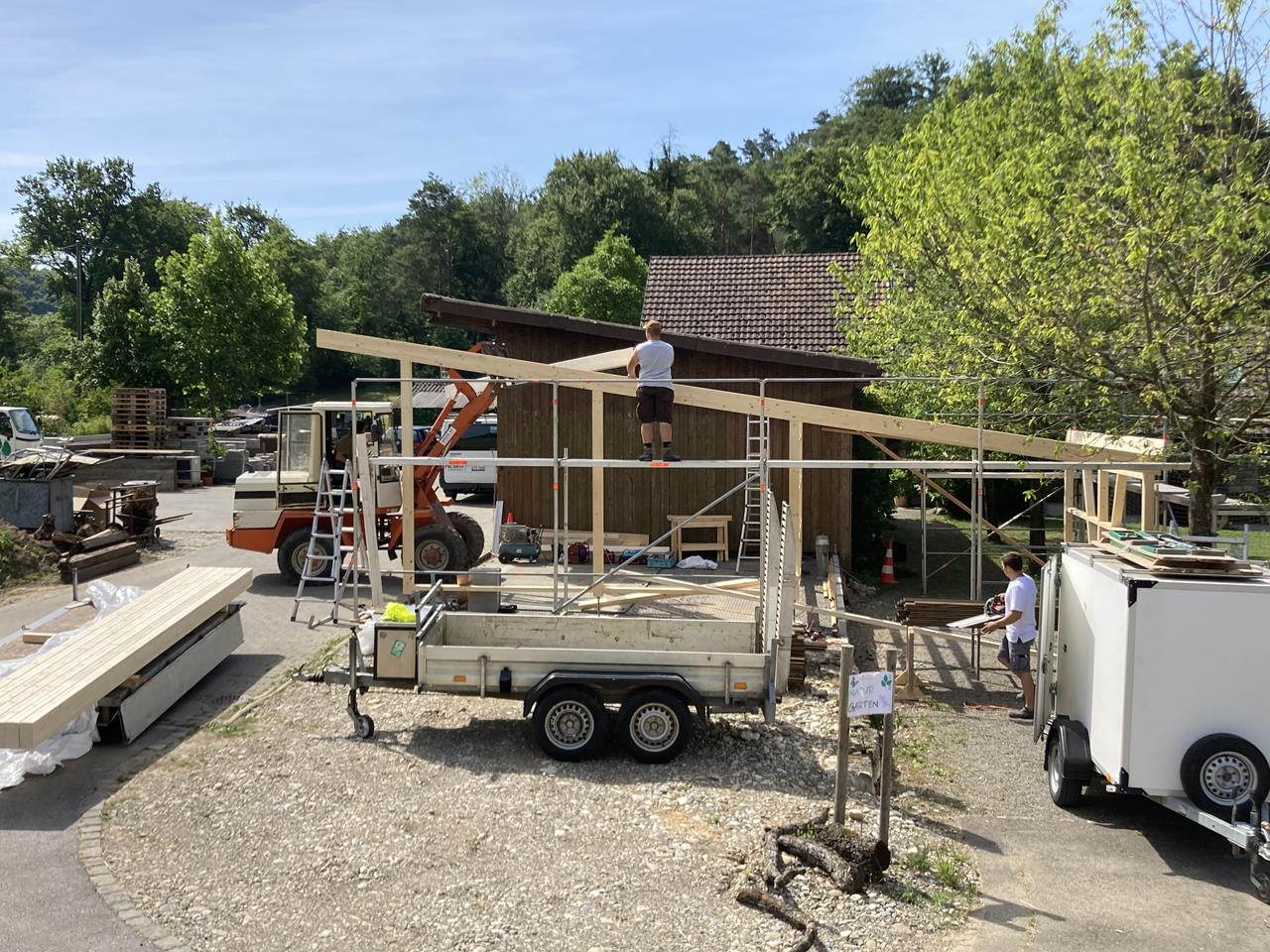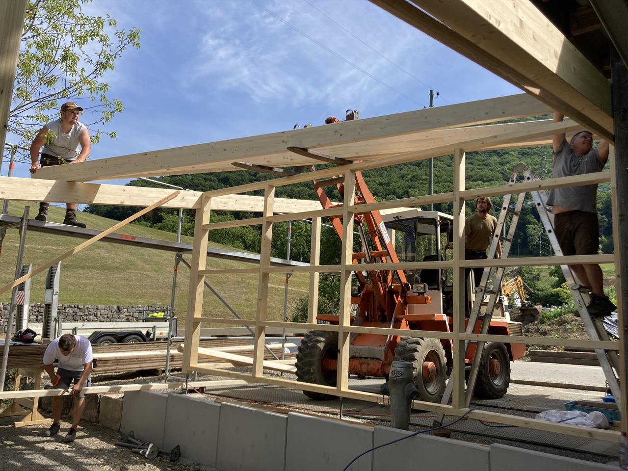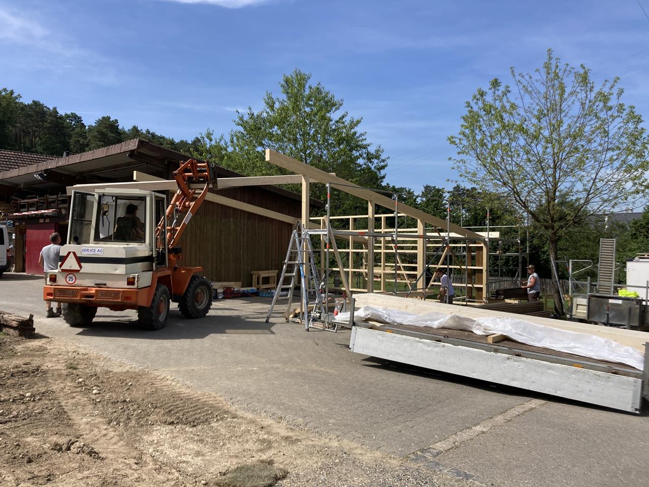 Unser Sohn Florian hat die Pläne gezeichnet und das Baugesuch vorbereitet. Nach längerem Hin und Her lag endlich die Baubewilligung vor und der Holzbauer konnte im Juni loslegen. Innert kürzester Zeit wurde unser Projekt realisiert. Das Berner-Team freut sich über den Unterstand für unsern Betrieb - und Sara ist glücklich über ihren gedeckten Parkplatz für ihr Fahzeug!